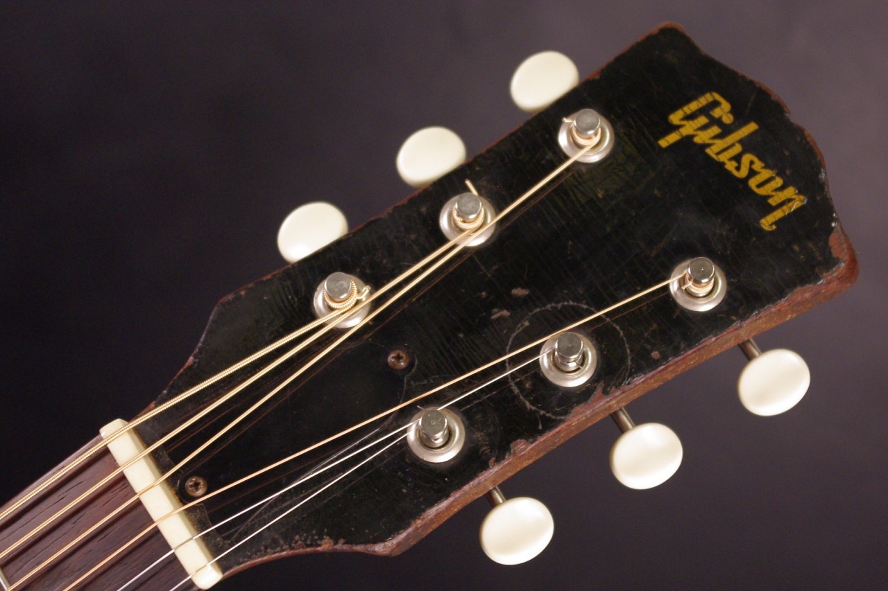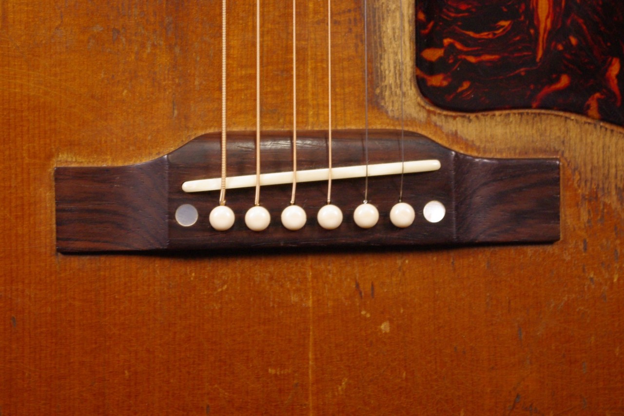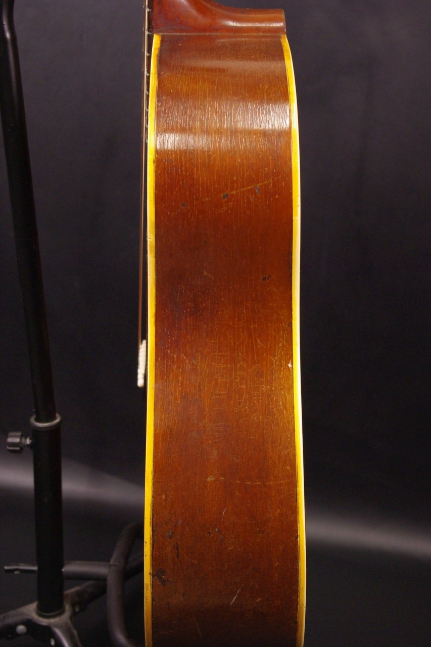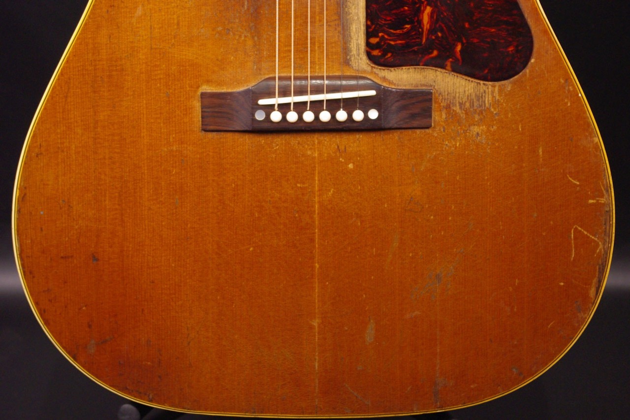 1950年代ラージピックガード期のJ-50が傷多めのためお買い得!!トップはスプルース、サイドバックにはマホガニー、指板とブリッジにはハカランダのノーマルサドルを採用、J-45のナチュラルカラーとして生産される人気ラウンドショルダーモデル!ペグは3連クルーソンタイプに交換されています。ピックガードはオリジナルですが貼り直しされています。ブリッジはオリジナルで残っていました。バックの右側に長いクラック補修箇所があります。トップの左くびれ付近とピックガードの内側に沿ってクラック補修箇所があります。サウンドホールとピックガード周囲には激しい弾き傷が確認できます。シリアルナンバーから1956年製でネックには演奏による塗装の剥離、全体的に傷、ウェザーチェックと使用感が凄く貫録、存在感がありますね!調整はしっかりと行き届いていますので演奏性、サウンドは抜群ですよ。ネックヒールへはストラップピンの穴埋め修正があります。以前にピックアップを取り付けていたためエンドホールが広がっています。現在はコンバージョン用のエンドピンで対応しています。ナット幅は約42mm、60年代と比べると厚みのあるしっかりとしたグリップです。ネックリセット、リフレット済みで演奏性も良いです。弦高は12フレット6弦側で約2.6mm、1弦側で約1.8mmの高さでサドル残もありますので微調整にも余裕があります。大変弾きこまれておりカリンカリンに枯れた味わい深いサウンドで完成されています。音量が凄くボディ全体が震えていますね!是非この機会にお試しください!汎用ハードケース付き