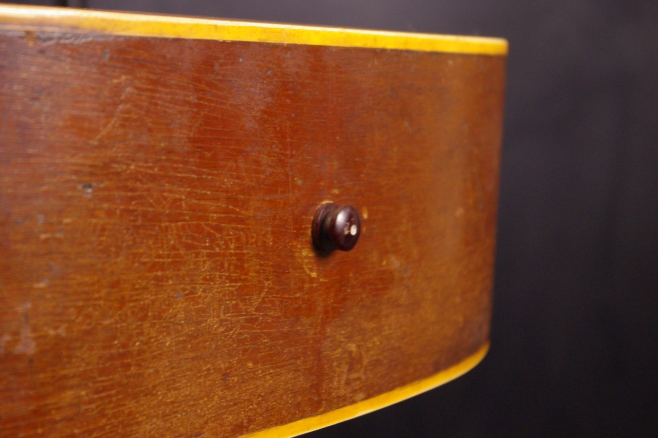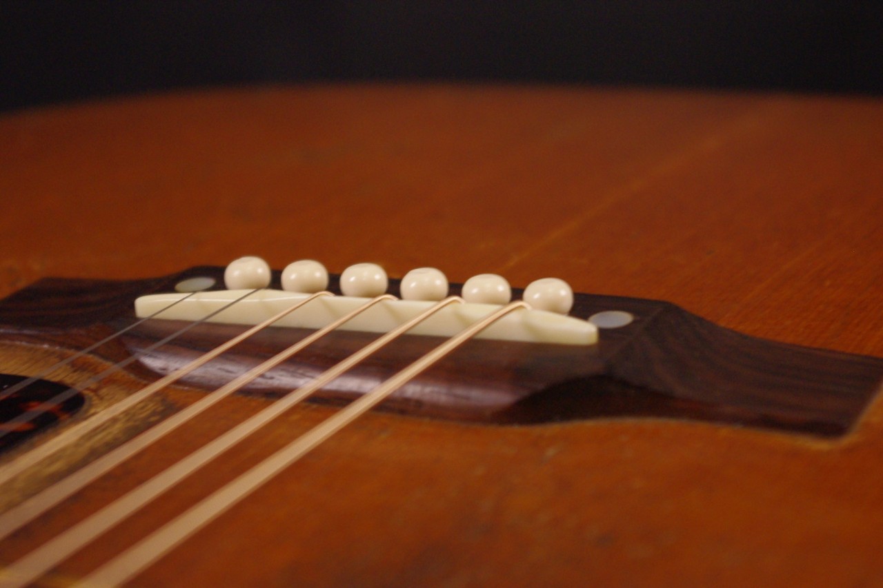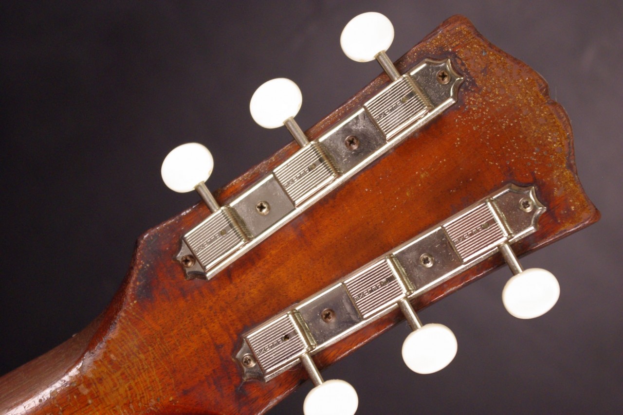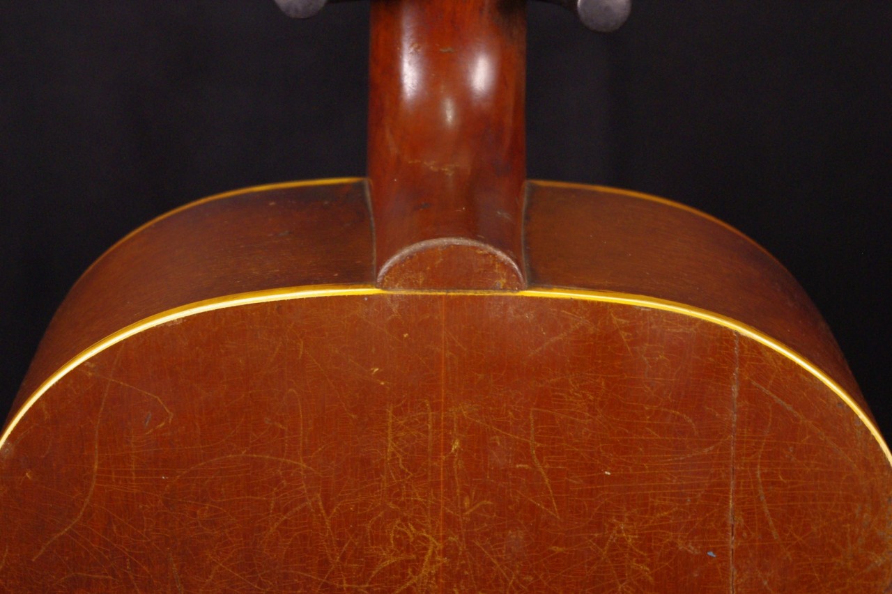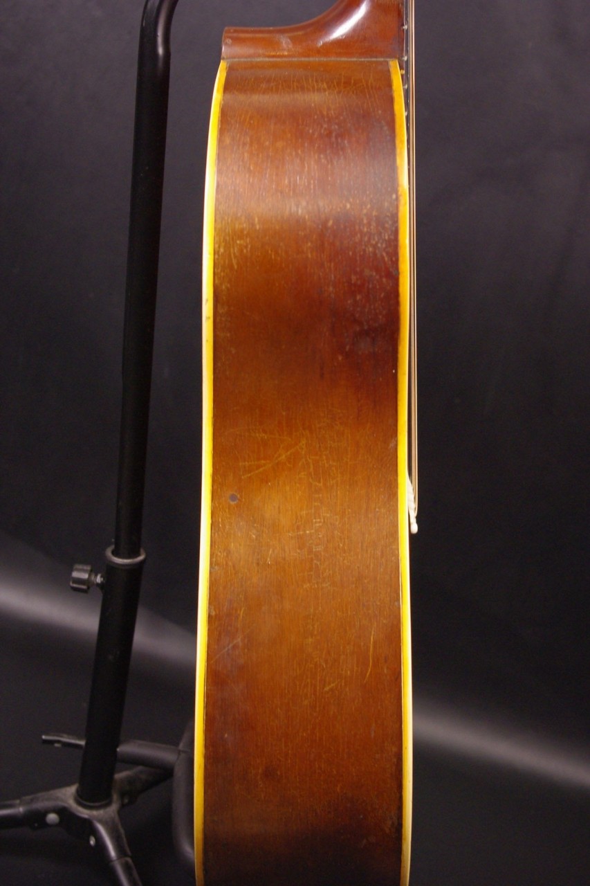 1950年代ラージピックガード期のJ-50が傷多めのためお買い得!!トップはスプルース、サイドバックにはマホガニー、指板とブリッジにはハカランダのノーマルサドルを採用、J-45のナチュラルカラーとして生産される人気ラウンドショルダーモデル!ペグは3連クルーソンタイプに交換されています。ピックガードはオリジナルですが貼り直しされています。ブリッジはオリジナルで残っていました。バックの右側に長いクラック補修箇所があります。トップの左くびれ付近とピックガードの内側に沿ってクラック補修箇所があります。サウンドホールとピックガード周囲には激しい弾き傷が確認できます。シリアルナンバーから1956年製でネックには演奏による塗装の剥離、全体的に傷、ウェザーチェックと使用感が凄く貫録、存在感がありますね!調整はしっかりと行き届いていますので演奏性、サウンドは抜群ですよ。ネックヒールへはストラップピンの穴埋め修正があります。以前にピックアップを取り付けていたためエンドホールが広がっています。現在はコンバージョン用のエンドピンで対応しています。ナット幅は約42mm、60年代と比べると厚みのあるしっかりとしたグリップです。ネックリセット、リフレット済みで演奏性も良いです。弦高は12フレット6弦側で約2.6mm、1弦側で約1.8mmの高さでサドル残もありますので微調整にも余裕があります。大変弾きこまれておりカリンカリンに枯れた味わい深いサウンドで完成されています。音量が凄くボディ全体が震えていますね!是非この機会にお試しください!汎用ハードケース付き