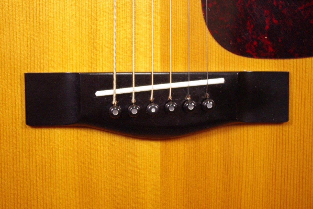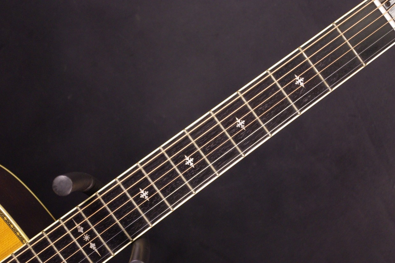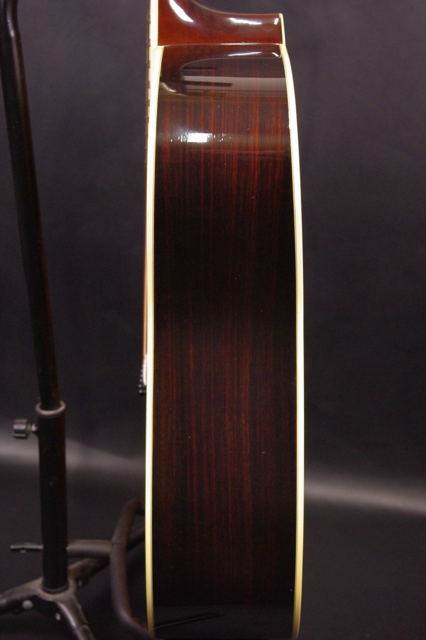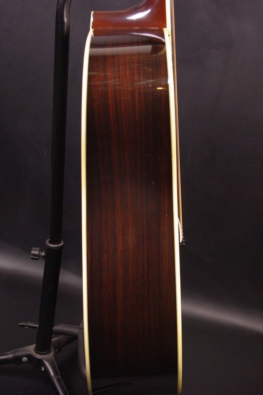 1980年代に生産されたL-10後期が入荷しました!!トップはえぞ松、サイドバックにはパリサンドルのオール単板を採用、シリアルナンバーとスペックから1983年製が有力でネックボディに細かい傷はありますが40年以上経過しているわりには綺麗に残っています。ゴールドペグ、べっ甲柄ピックガードなど主なパーツもオリジナルで残っています。ネックヒールへのストラップピンやピックアップなど特別な加工もございません。ナット幅は約44mm近くのやや太めのしっかりとしたグリップになります。ネックのアングルも理想的でトラスロッドの動作も問題なく機能しています。フレットは多少の減りは出ていますがまだまだお使いいただけます。弦高は12フレット6弦側で約2.3mm、1弦側で約1.5mmの高さでハイポジションまで押さえやすく調整しています。ブリッジもオリジナルの高さをキープしておりサドル残もありますので微調整も可能です。サドルは牛骨材で仕上げていますので音も良いです!力強い低音、ヤマハらしいキラキラとした煌びやかな高音が魅力!ピックを使っても指で弾いてもバランスがよく気持ちよく抜けてくれます!是非この機会にお試しください。おすすめ!!汎用ハードケース付き