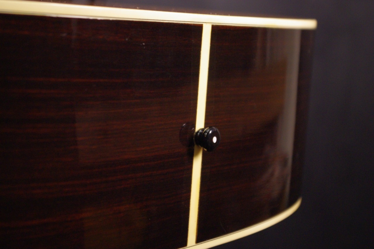 トップ えぞ松単板、サイドバック パリサンドル単板、指板・ブリッジ 黒檀、ネック マホガニー、オリジナルゴールドペグ、オリジナルべっ甲柄ピックガード、Xブレーシング、