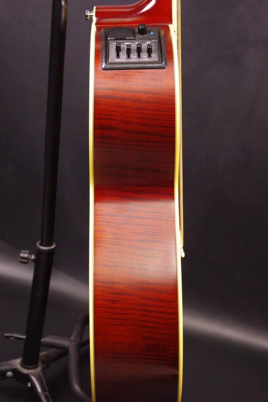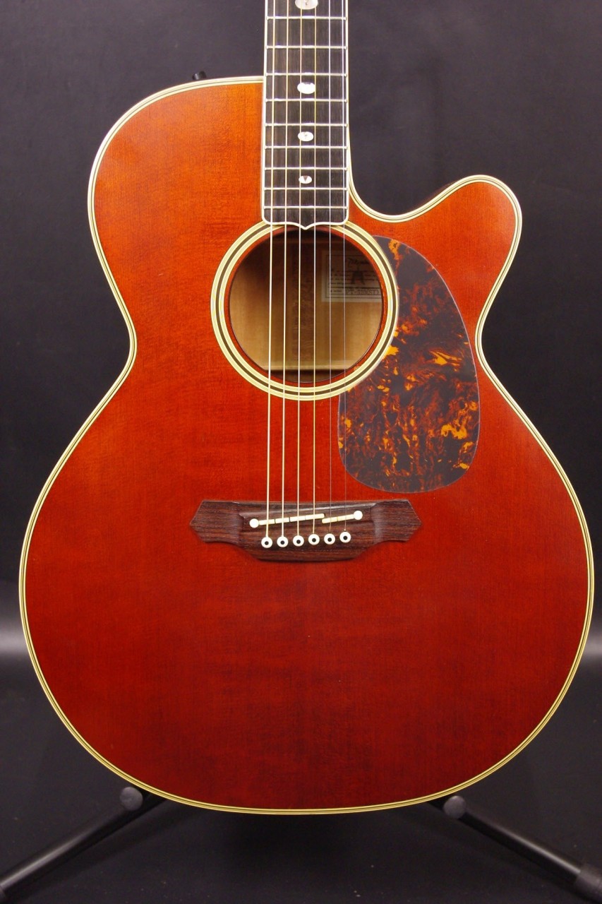 1990年代タカミネのエレアコ PT-520 STが入荷しました!!トップはスプルース単板、サイドバックとネックにはメイプル材を採用、ステレオ出力が可能なパラスティックステレオピックアップシステムが搭載されたカッタウェイ仕様のエレアコでライブでお使いいただけます!トップ裏のスタンプから1994年製で多少の傷はありますが全体的に綺麗に残っています。元々ピックガードは無いモデルで後から貼ってあります。ペグ、ブリッジはオリジナルで残っていました。ナット幅は約42mmのやや薄めのグリップで幅広い演奏に対応できます。ネックのアングルも理想的でトラスロッドの動作にも余裕があります。フレットの減りは少々ありますが今後もまだまだお使いいただけます。弦高は12フレット6弦側で約2.2mm、1弦側で約1.8mmの高さで押さえやすく調整しています。ブリッジからサドル残もありますのでお好みに合わせた微調整にもお応えいたします。【1.3.5弦と2.4.6弦】【1.2.3弦と4.5.6弦】【1~6弦】の3パターンのステレオ出力が可能です。サイドバックは合板ですが生音もメイプルらしいキレの良いサウンドでお楽しみいただけます!!是非この機会にお試しください!オリジナルハードケース付き