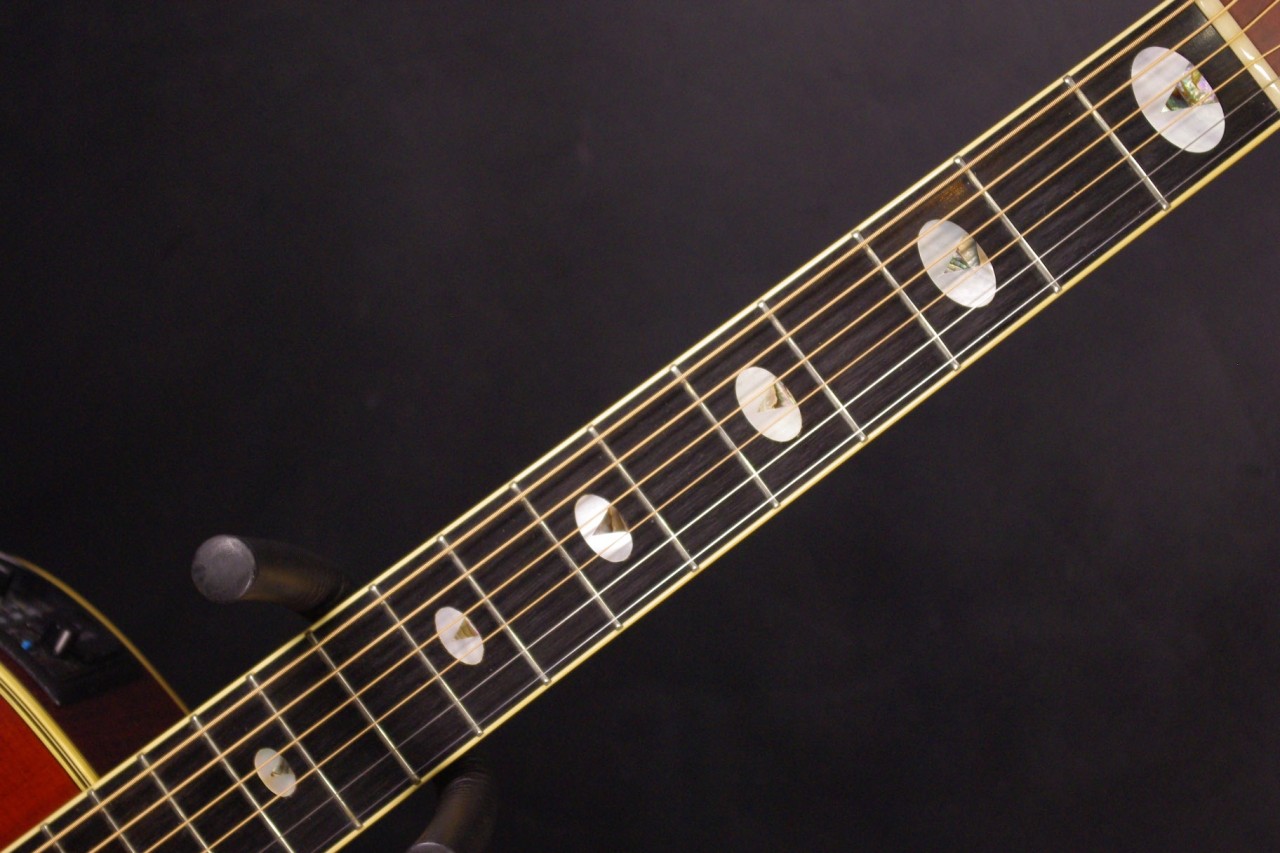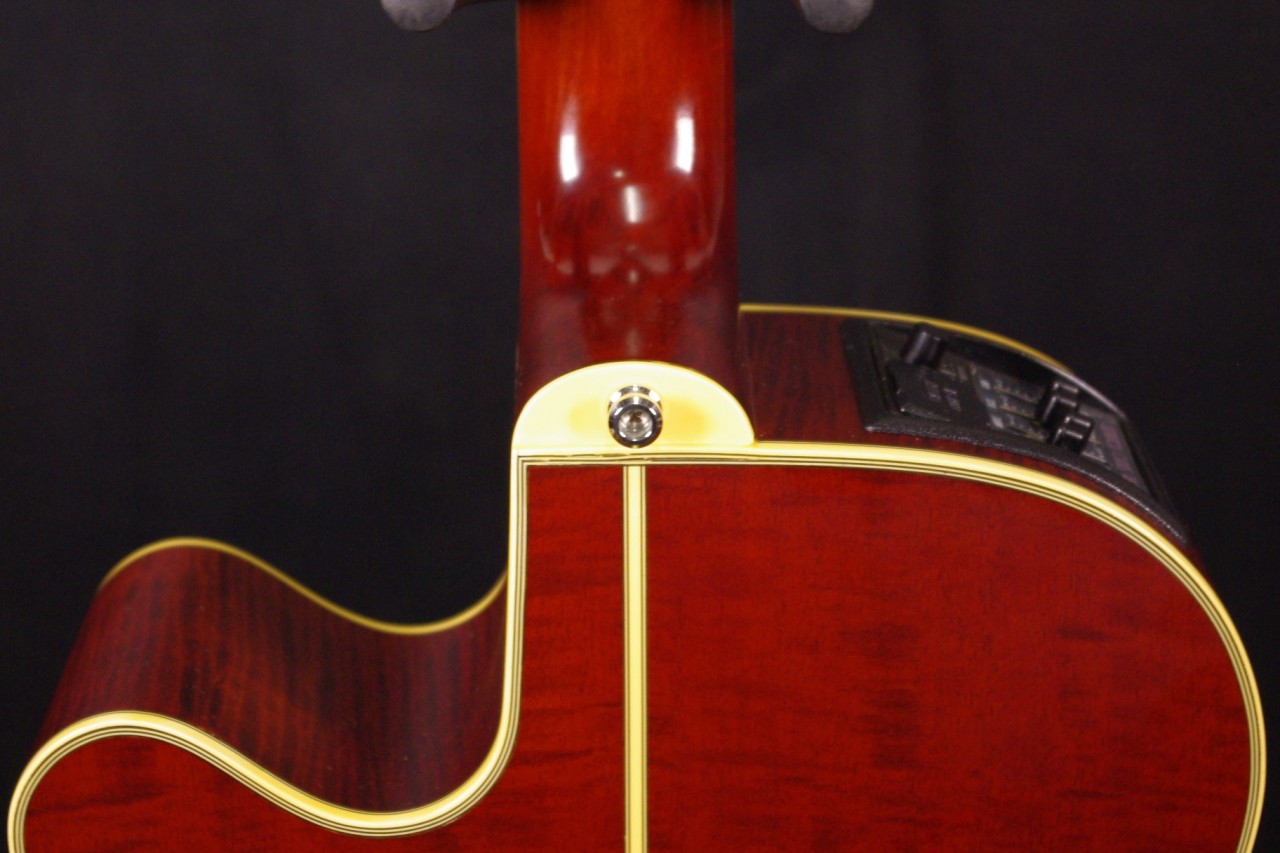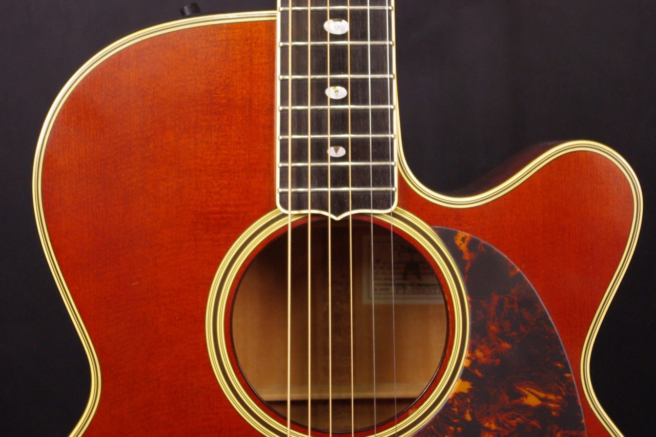 トップ スプルース単板、サイドバック メイプル、指板・ブリッジ エボニー、ネック メイプル、オリジナルゴールドペグ、べっ甲柄ピックガード、カッタウェイ、Xブレーシング、パラスティックステレオピックアップシステム搭載、