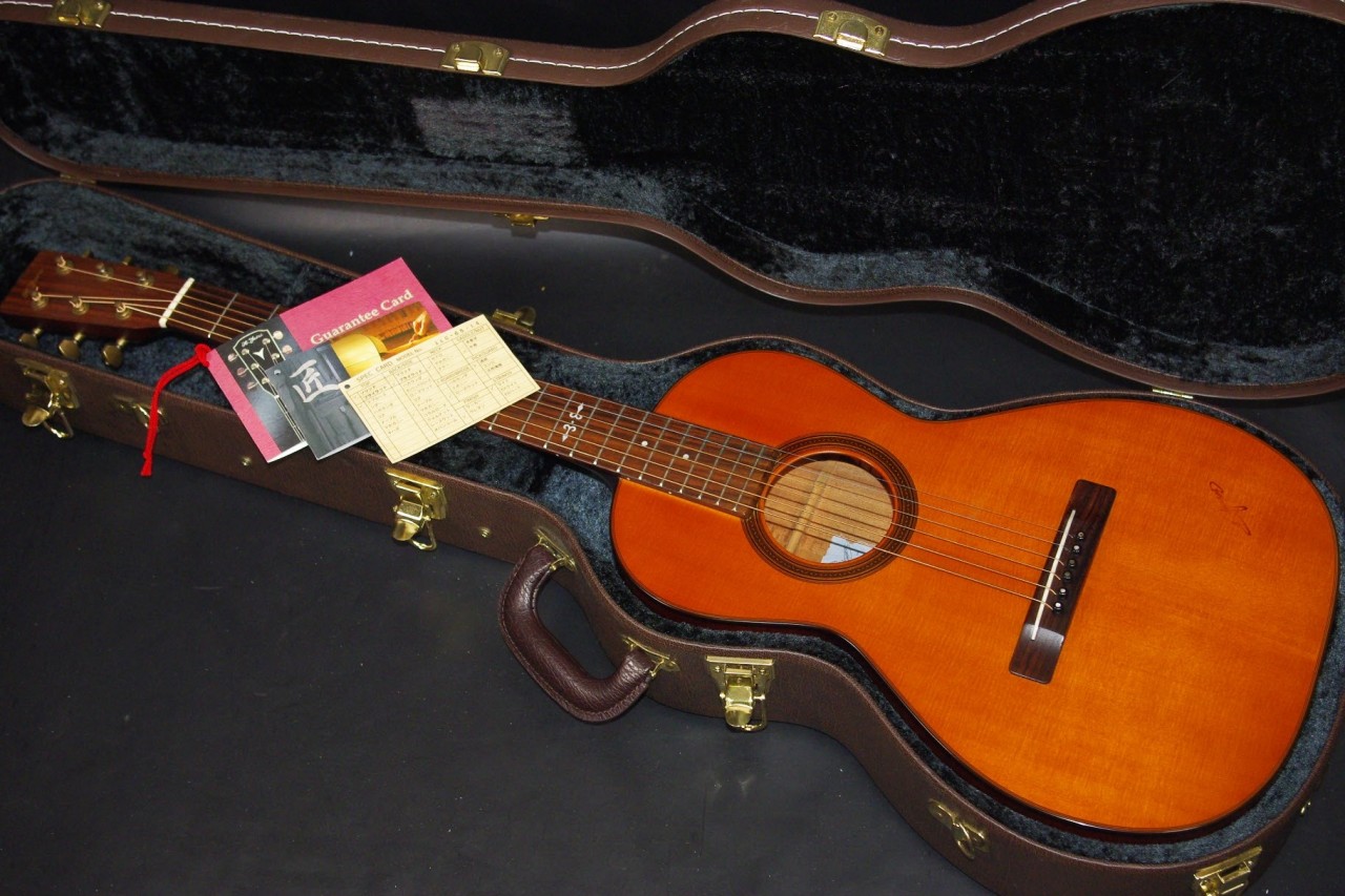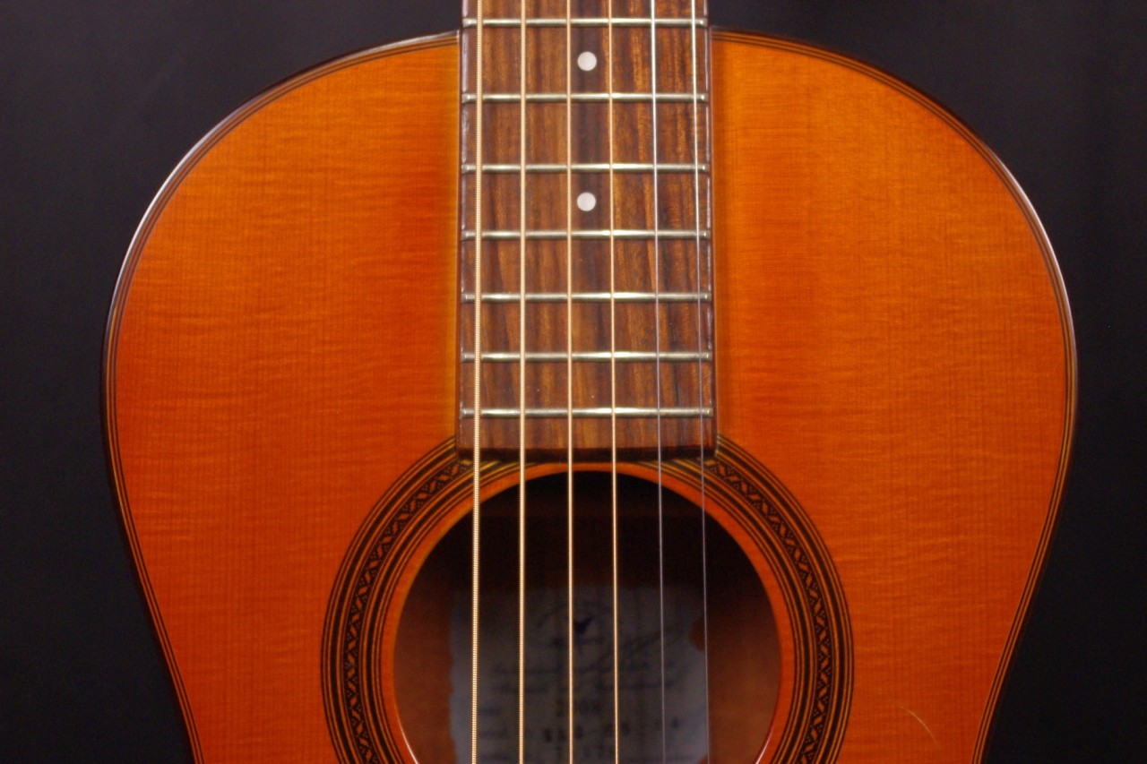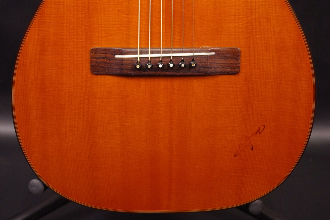 2009年製のK.YAIRI RAG-65-14が入荷しました!!トップはスプルース単板、サイドバックにはマホガニーの合板を採用、コンパクトなボディ形状で手軽にお楽しみいただけるモデルです!14フレットジョイントが特徴で弦長も650mm近くありますのでしっかりと音も抜けてくれます!生産から15年以上経過していますが使用感も少なく綺麗で演奏性も充実しています。ペグ、ブリッジもオリジナルでネックヒールへのストラップピンやピックアップなど特別な加工もございません。ナット幅は約42mmのやや薄めのグリップで一般的なアコースティックギターと変わらないサイズ感です。ネックのアングルも理想的でトラスロッドの動作も問題なく機能しています。フレットは少々の減りは出ていますが長期で安心です。弦高は12フレット6弦側で約2.1mm、1弦側で約1.2mmの高さで押さえやすく調整しています。お好みに合わせた微調整にもお応え致します。明かるく軽快なサウンドで指で弾いても粒立ちが良くすっくりと前に抜けてくれます!くつろぎながら弾きらくなる1本でしょう!是非この機会にどうぞ!オリジナルハードケース付。