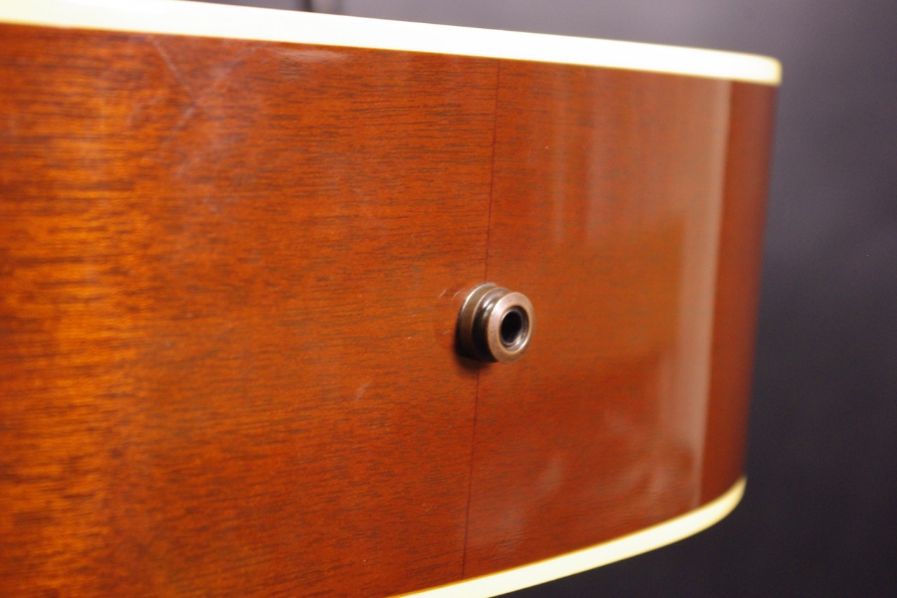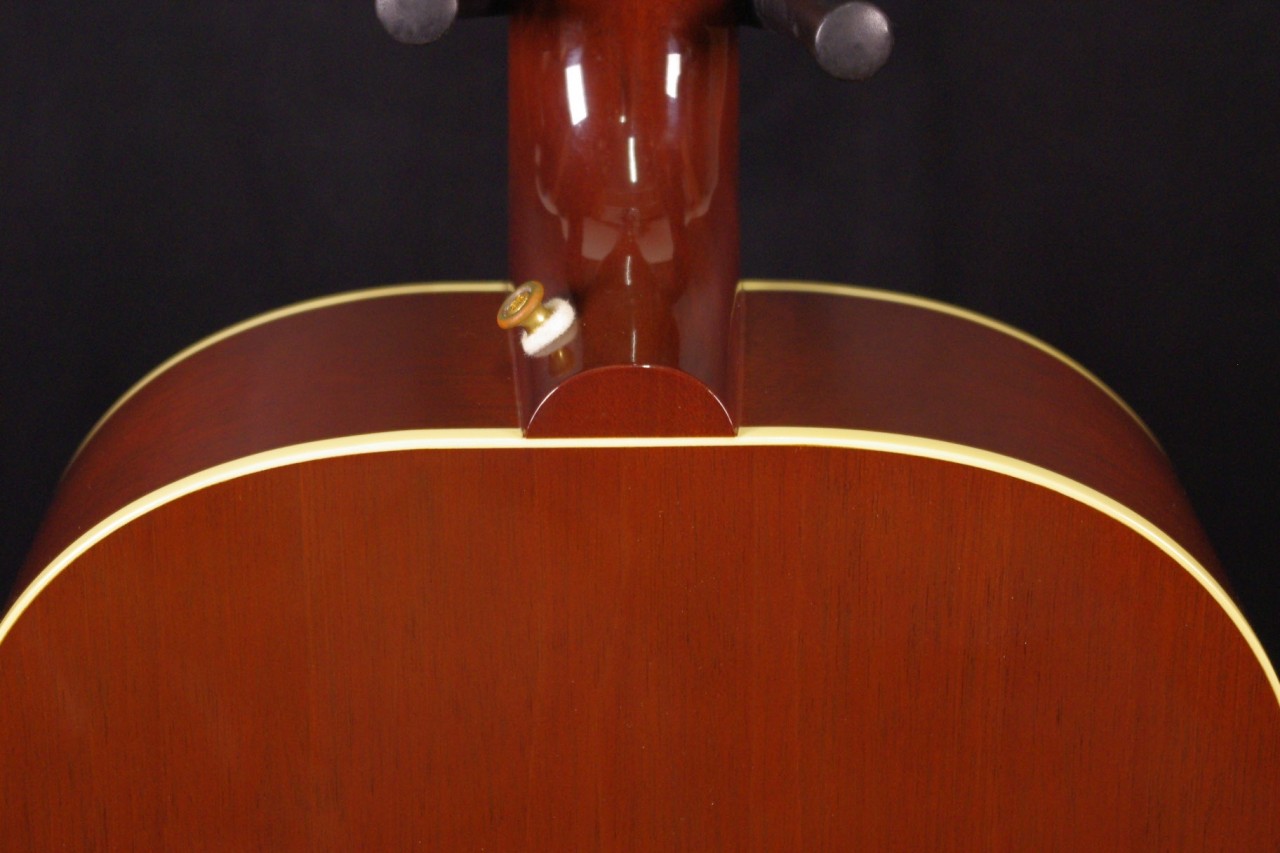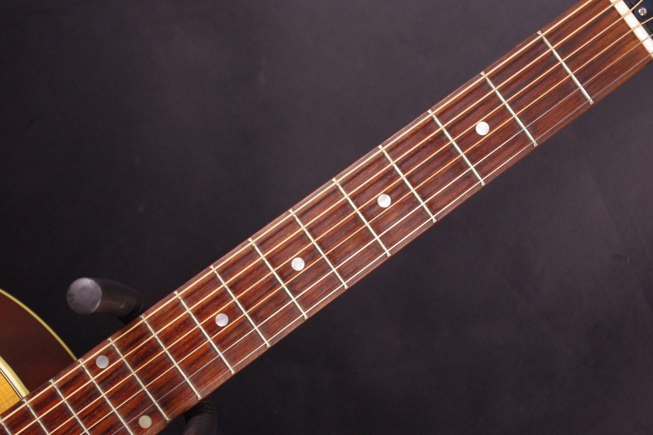 1950年代を再現した2020年製のJ-50 1950sが入荷しました!トップはスプルース、サイドバックにはマホガニー、指板とブリッジにはローズウッド、ノーマルサドルのJ-50でワンリング、ラージピックガードが特徴です!!クルーソン製の3連ペグ、ピックガードなど主なパーツもオリジナルで残っています。ネックヒールへはストラップピンが打っています。LRBaggs社のエレメントVTCピックアップが新品時から搭載されておりライブでもお使いいただけます!使用感は少々ありますが特別に目立った傷のない美品で演奏性、サウンドも優れています。ナット幅は約43mm弱の50年代を感じさせるしっかりとしたグリップでアングルも理想的です。トラスロッドの動作にも余裕がありました。フレットの減りも少なく長期で気にしないでご使用いただけます。弦高は12フレット6弦側で約2.3mm、1弦側で約1.6mmの高さでハイポジションまで押さえやすく調整されています。お好みに合わせた高さに微調整も可能です。Xブレーシングはスキャロップドのためふくよかな低中音でスロトークでは纏まりがよくパワフル!指弾きも軽いタッチで響きますよ!探していた方は是非この機会にどうぞ!オリジナルハードケース付き