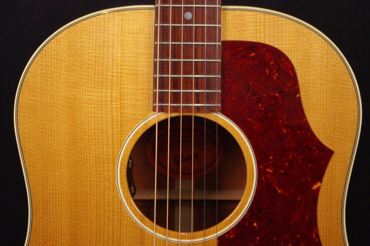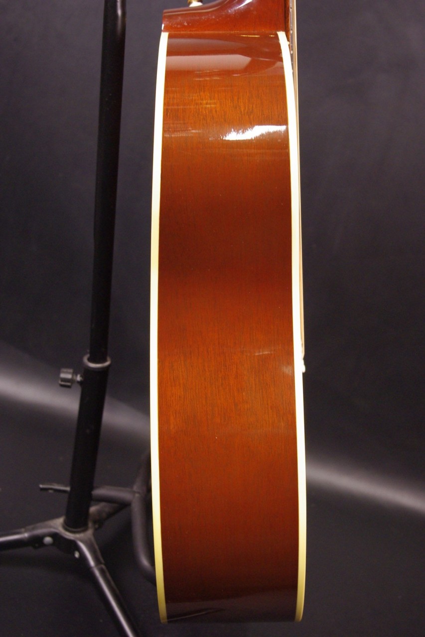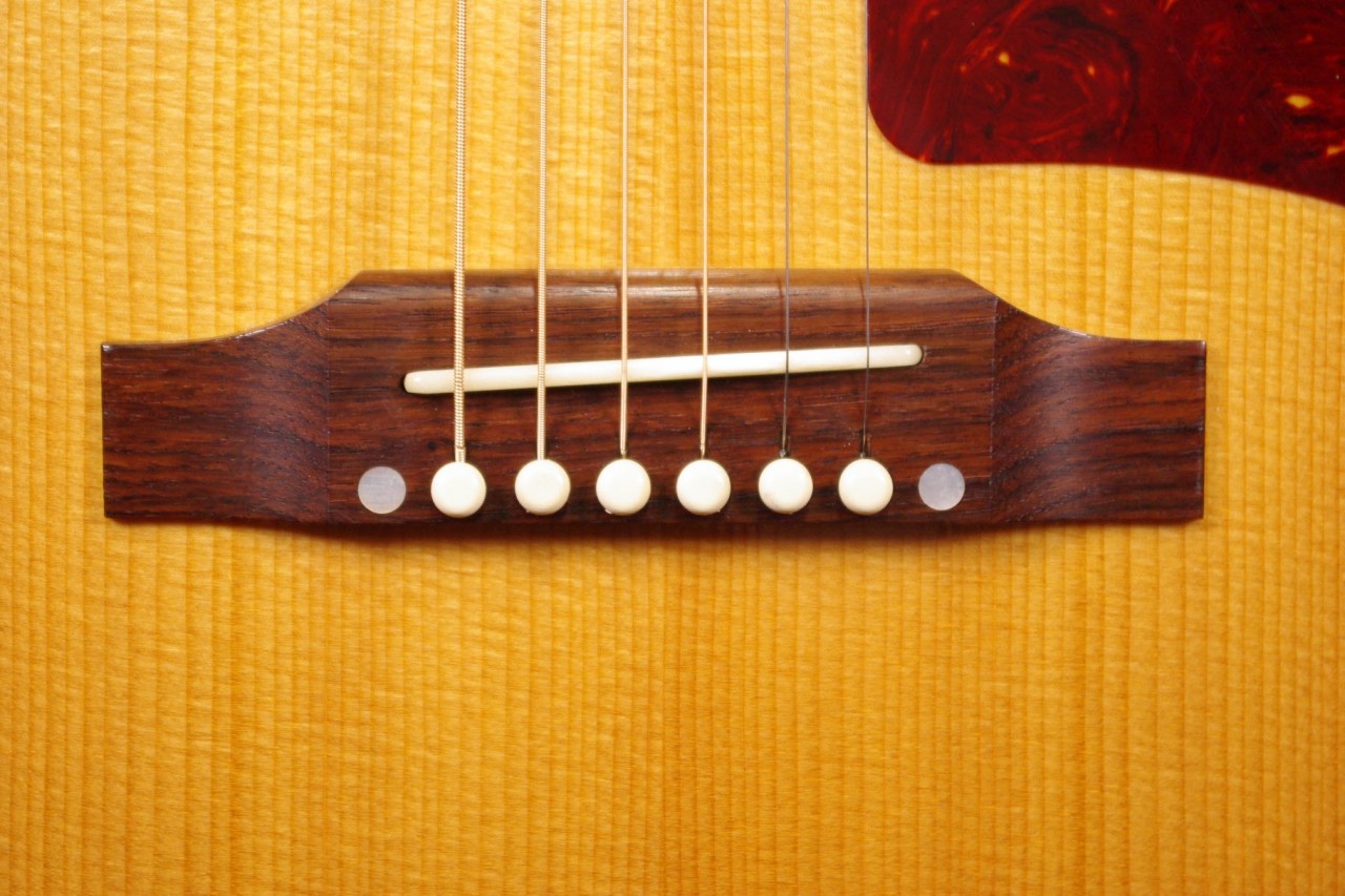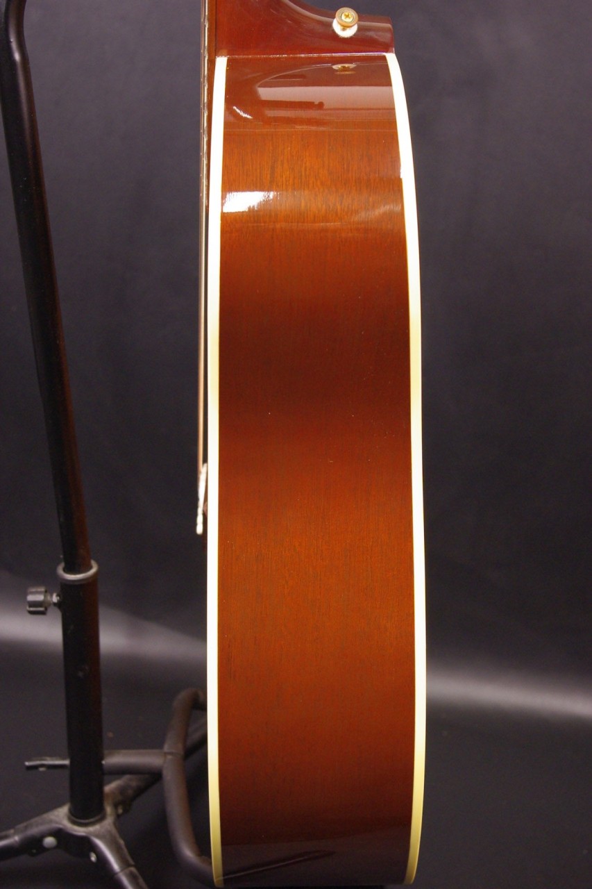 1950年代を再現した2020年製のJ-50 1950sが入荷しました!トップはスプルース、サイドバックにはマホガニー、指板とブリッジにはローズウッド、ノーマルサドルのJ-50でワンリング、ラージピックガードが特徴です!!クルーソン製の3連ペグ、ピックガードなど主なパーツもオリジナルで残っています。ネックヒールへはストラップピンが打っています。LRBaggs社のエレメントVTCピックアップが新品時から搭載されておりライブでもお使いいただけます!使用感は少々ありますが特別に目立った傷のない美品で演奏性、サウンドも優れています。ナット幅は約43mm弱の50年代を感じさせるしっかりとしたグリップでアングルも理想的です。トラスロッドの動作にも余裕がありました。フレットの減りも少なく長期で気にしないでご使用いただけます。弦高は12フレット6弦側で約2.3mm、1弦側で約1.6mmの高さでハイポジションまで押さえやすく調整されています。お好みに合わせた高さに微調整も可能です。Xブレーシングはスキャロップドのためふくよかな低中音でスロトークでは纏まりがよくパワフル!指弾きも軽いタッチで響きますよ!探していた方は是非この機会にどうぞ!オリジナルハードケース付き