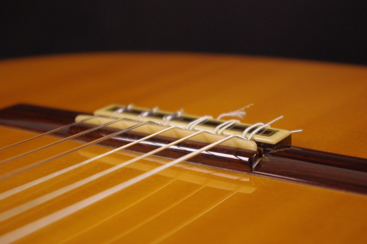 ラミレスギターを受け継いだ本場スペインを代表する製作家マリアーノ・テサーノスのフラメンコギターが入荷!!トップはスプルース、サイドバックには主流のシープレスの厳選された材を採用、反応が素早く明瞭なキレの良いサウンドが特徴です!ボディ内のラベルから2006年に生産された個体でゴルペ板周囲にポツポツと弾き傷がありますが全体的に綺麗で演奏性も優れています。ペグなど主なパーツもオリジナルで残っています。ストラップピンやピックアップなど特別な加工もございません。弦長は約650mm、ナット幅は約50.5mmのやや薄めの弾きやすいグリップでアングルも適正です。フレットの状態もよく長期で安心してお使いいただけます。弦高は12フレット6弦側で約2.8mm、1弦側で約2.1mmの高さでハイポジションまで押さえやすく調整されています。ブリッジからサドル残もありますので微調整にもお応えいたします。各弦にしっかりとハリ、芯があり軽いタッチで抜けてくれます!!探していた方は是非この機会に弾いてみてください!おすすめ!汎用ハードケース付き