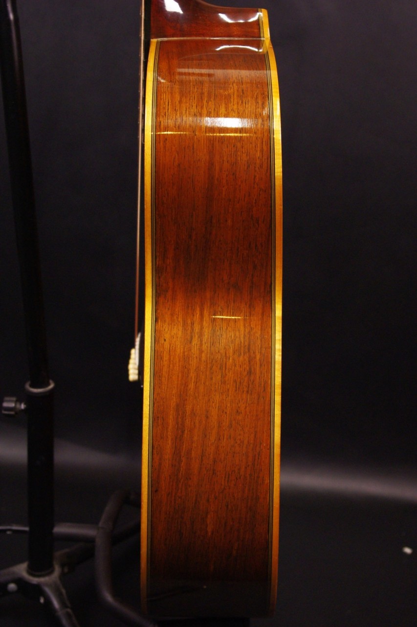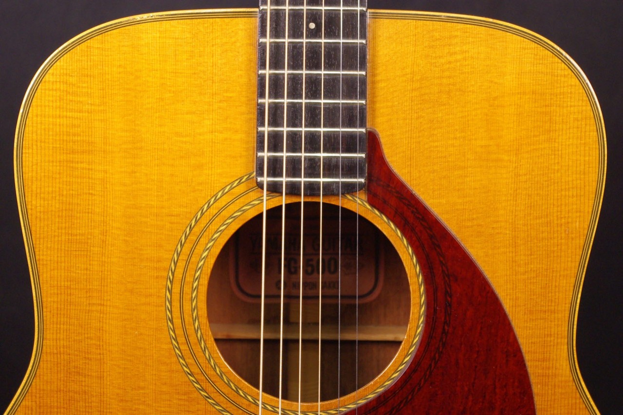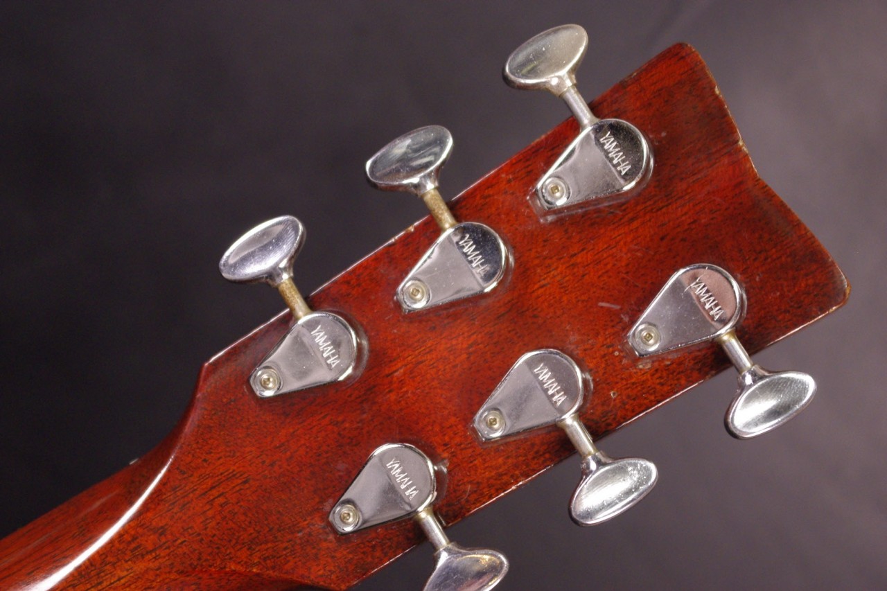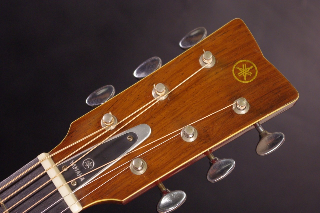 サイドバックに希少材ハカランダを採用した1970年代赤ラベル最上位機種FG-500が入荷しました!トップはスプルース単板、サイドはハカランダ合板、バックにはハカランダ単板を採用、シリアルナンバーから1971年製が有力でトップのバインディング近くに傷がありますが50年以上経過しているわりには大変綺麗で演奏性、サウンドも優れています!YAMAHAのオープンペグ、べっ甲柄ピックガード、ブリッジなど主なパーツもオリジナルで残っています。ネックヒールへのストラップピン加工はございません。以前にピックアップを取り付けしていたためエンドホールが広がっていますが現在はコンバージョン用のエンドピンで対応しています。ナット幅は約44mmのやや太めのしっかりとしたグリップでネックのアングルも適正、トラスロッドの動作も問題なく機能しています。フレットは多少の減りはありますがまだまだ余裕があります。弦高は12フレット6弦側で約2.8mm、1弦側で約2mmの高さで調整しています。ブリッジもオリジナルの高さでサドル残もあり微調整も可能です。エボニーブリッジはオリジナルの高さで残っています。反応が素早くハカランダらしい分離のよい煌びやかなサウンドが持ち味!!音量が凄く軽いタッチでスッキリと前に抜けてくれますね!是非この機会にお試しください!オリジナルヤマハハードケースつき