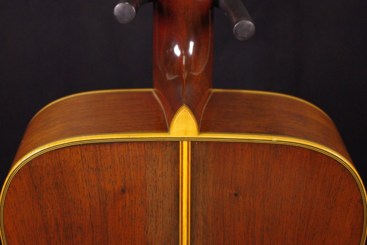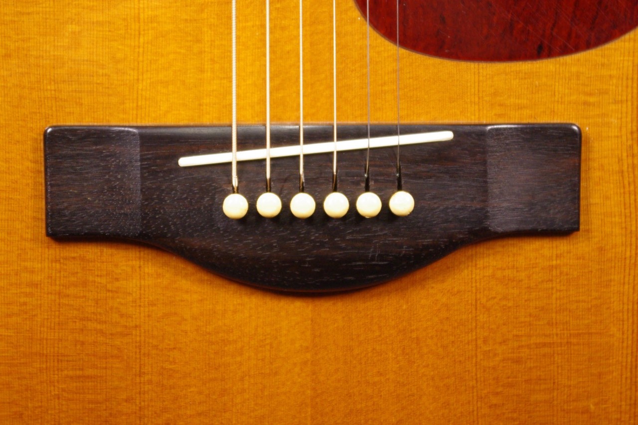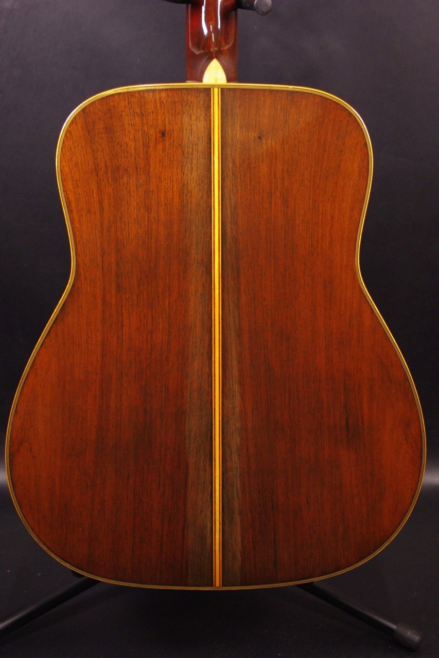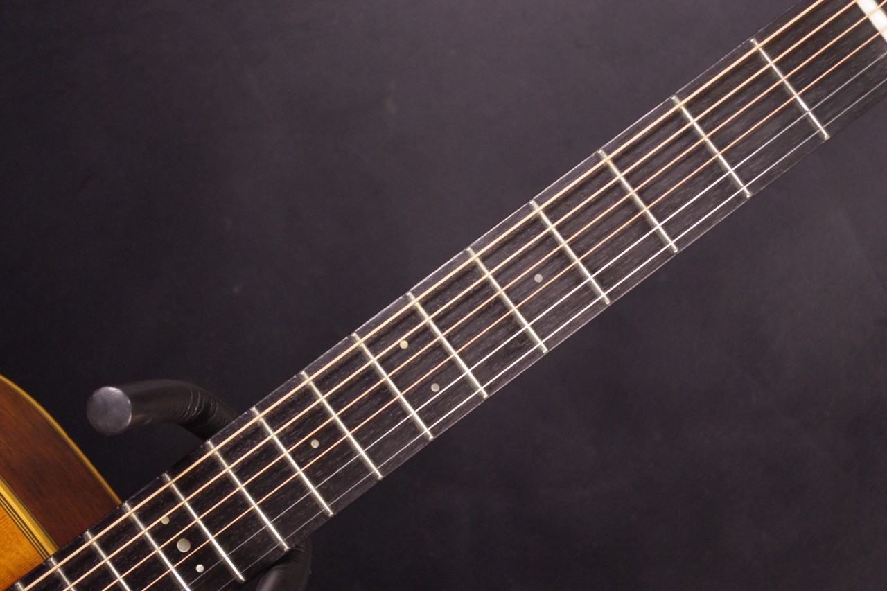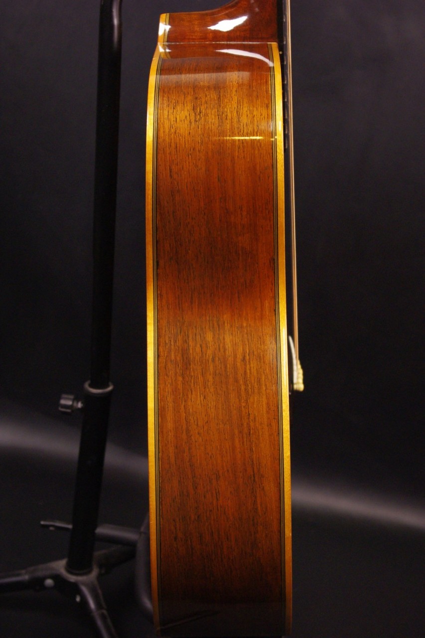 サイドバックに希少材ハカランダを採用した1970年代赤ラベル最上位機種FG-500が入荷しました!トップはスプルース単板、サイドはハカランダ合板、バックにはハカランダ単板を採用、シリアルナンバーから1971年製が有力でトップのバインディング近くに傷がありますが50年以上経過しているわりには大変綺麗で演奏性、サウンドも優れています!YAMAHAのオープンペグ、べっ甲柄ピックガード、ブリッジなど主なパーツもオリジナルで残っています。ネックヒールへのストラップピン加工はございません。以前にピックアップを取り付けしていたためエンドホールが広がっていますが現在はコンバージョン用のエンドピンで対応しています。ナット幅は約44mmのやや太めのしっかりとしたグリップでネックのアングルも適正、トラスロッドの動作も問題なく機能しています。フレットは多少の減りはありますがまだまだ余裕があります。弦高は12フレット6弦側で約2.8mm、1弦側で約2mmの高さで調整しています。ブリッジもオリジナルの高さでサドル残もあり微調整も可能です。エボニーブリッジはオリジナルの高さで残っています。反応が素早くハカランダらしい分離のよい煌びやかなサウンドが持ち味!!音量が凄く軽いタッチでスッキリと前に抜けてくれますね!是非この機会にお試しください!オリジナルヤマハハードケースつき